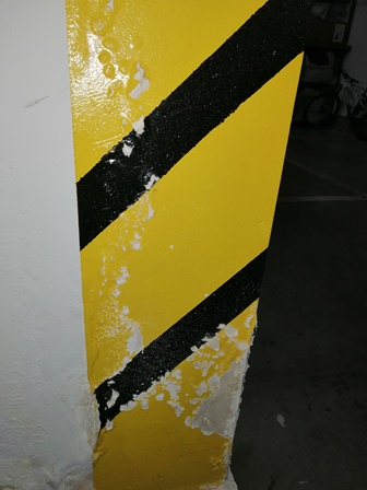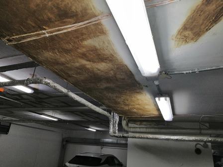 Множественные локальные обработки потолка паркинга гидроизоляционными материалами, являются следствием протекания воды сквозь бетонную плиту толщиной 40 см.